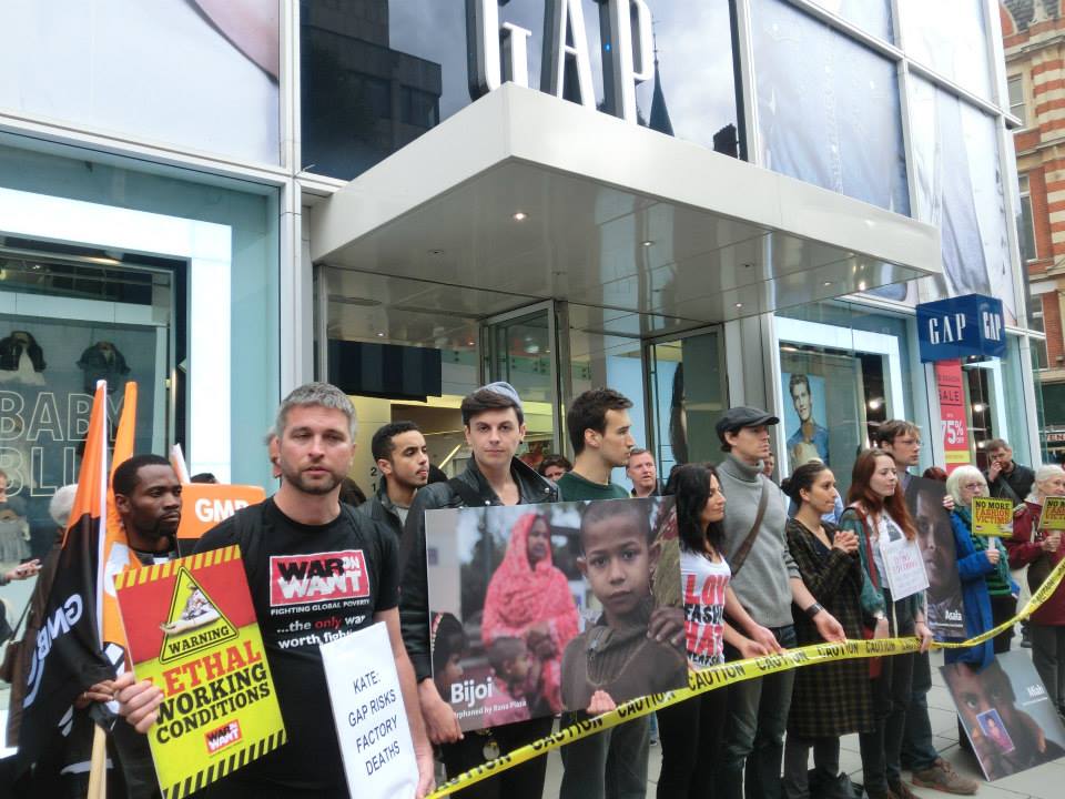 このキャンペーンでは、GAPの店舗の前に人の鎖を作り、「ラナプラザ・ネバーアゲイン(ラナプラザを絶対発生させない)」と参加者全員でのシュプレヒコールを実施し訴えています。
