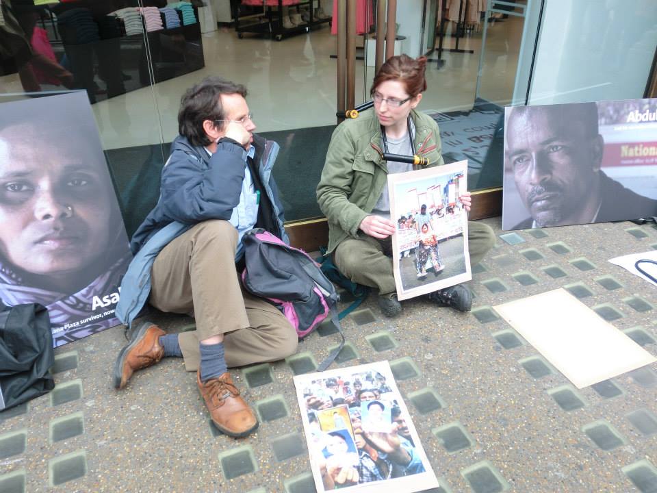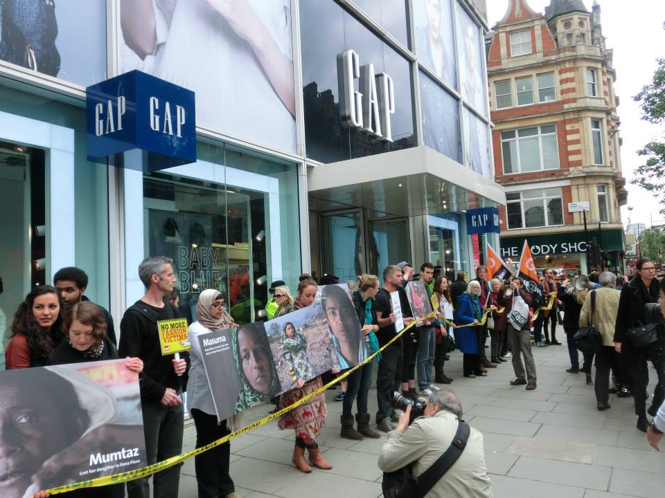 サステイナビジョンの下田屋は、「ラナプラザ・アニバーサリー・アクション」というキャンペーンに参加。これは、「レイバー・ビハインド・ラベル」という団体の主催で、ロンドンのオックスフォードストリート沿いにある、米系アパレル企業GAPの店舗の前で開催されました。