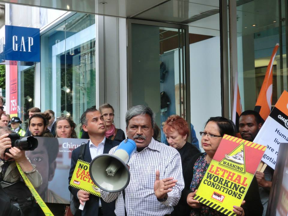 このキャンペーンには、バングラデシュ国立衣料品労働者連盟会長のアミルイ・ハク・アミン氏が参加、GAPの店舗前で、「ラナプラザの被害者やその家族に対する補償が進んでいない。すぐに補償金が支払われるべきだ。」と訴え、またGAPは、当時ラナプラザから調達をしていたにも関わらず、世界的な動きである「アコード」への参加を拒否したとして糾弾されています。またアミン氏は、「アライアンスは、自発的なもので、法的強制力はなく活動としては弱い、またより多くの補償金を支払うべきだ」と非難しました。